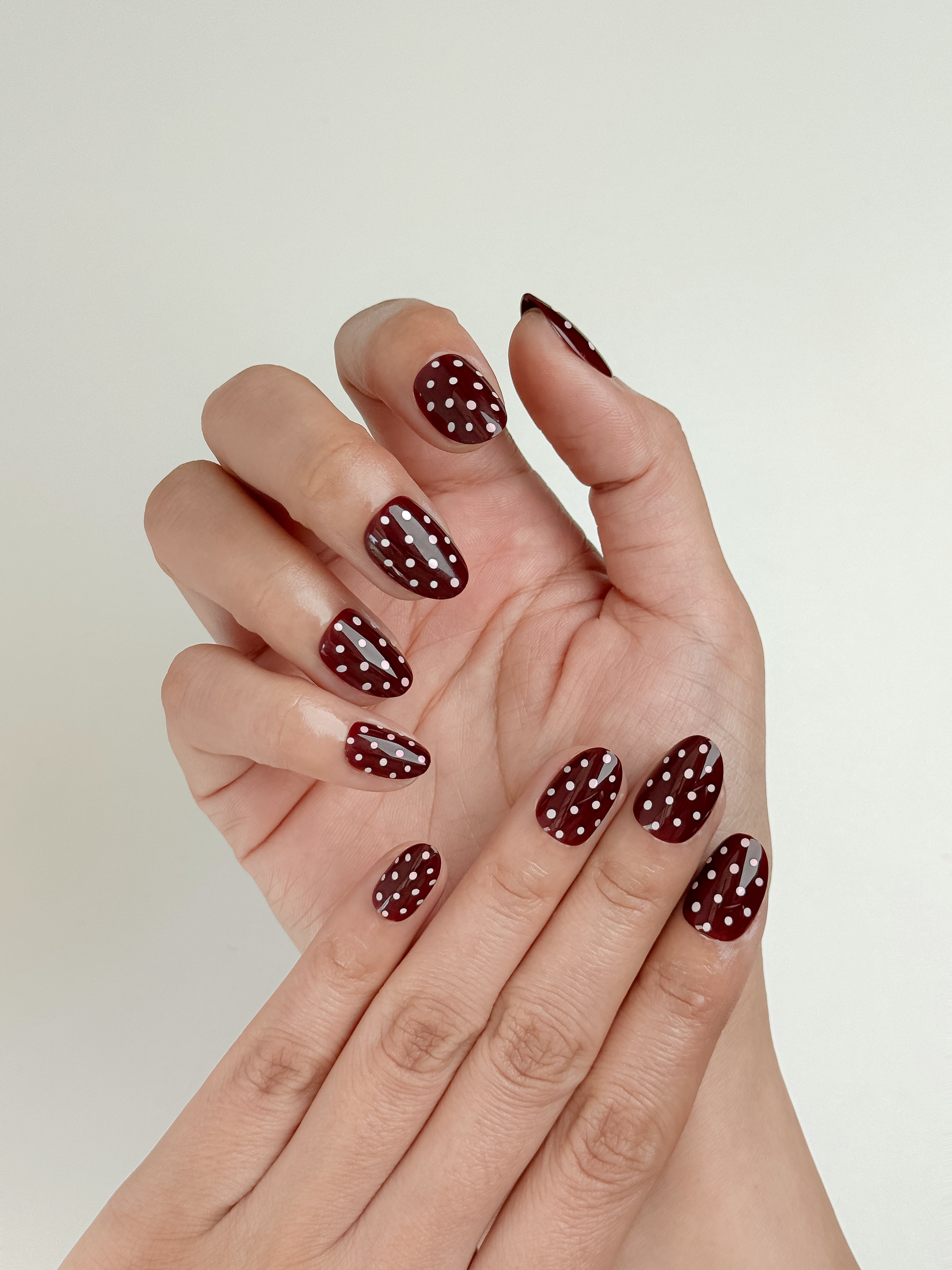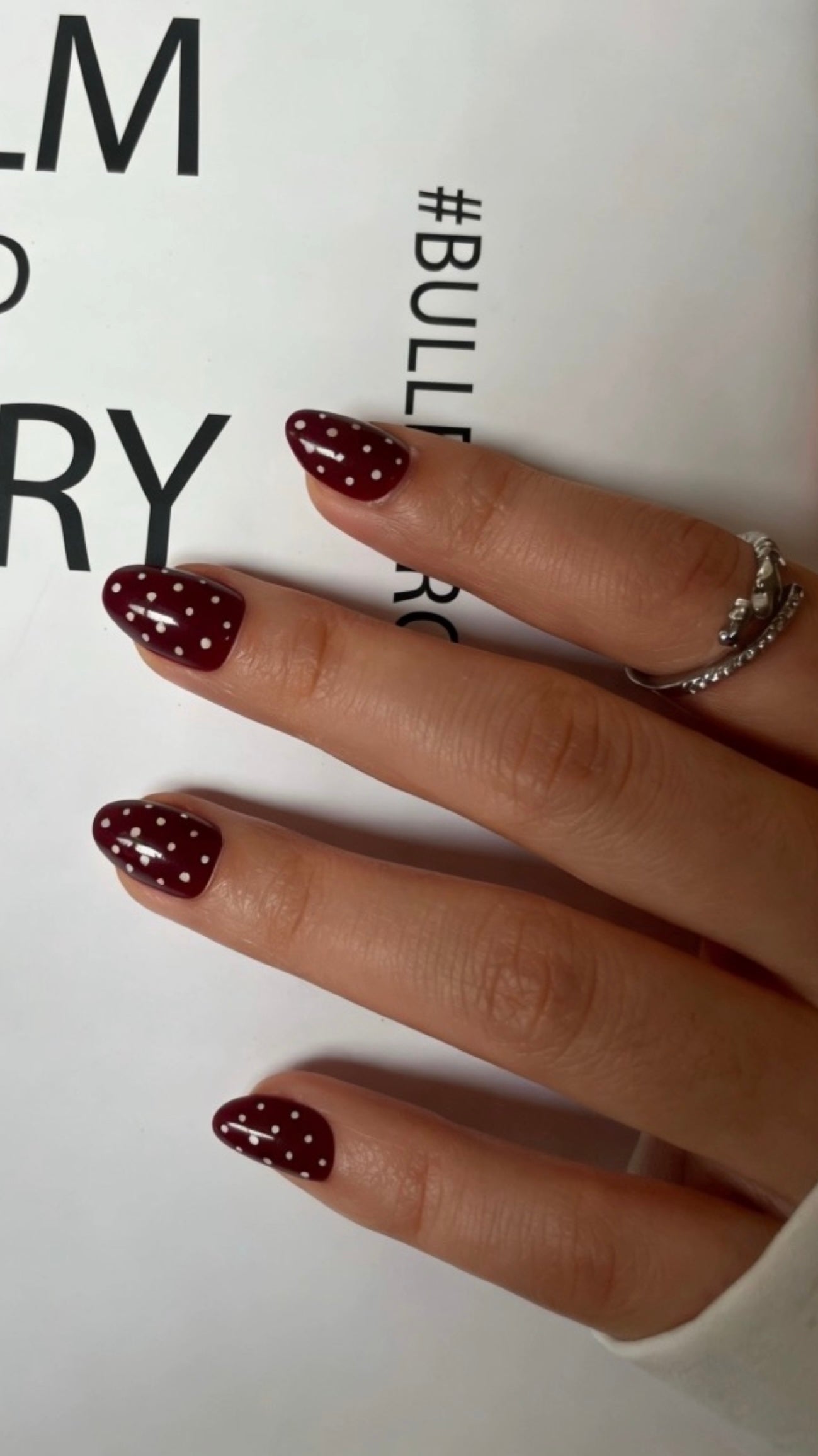 A rich burgundy-cherry base paired with crisp white dots for a timeless yet playful aesthetic.