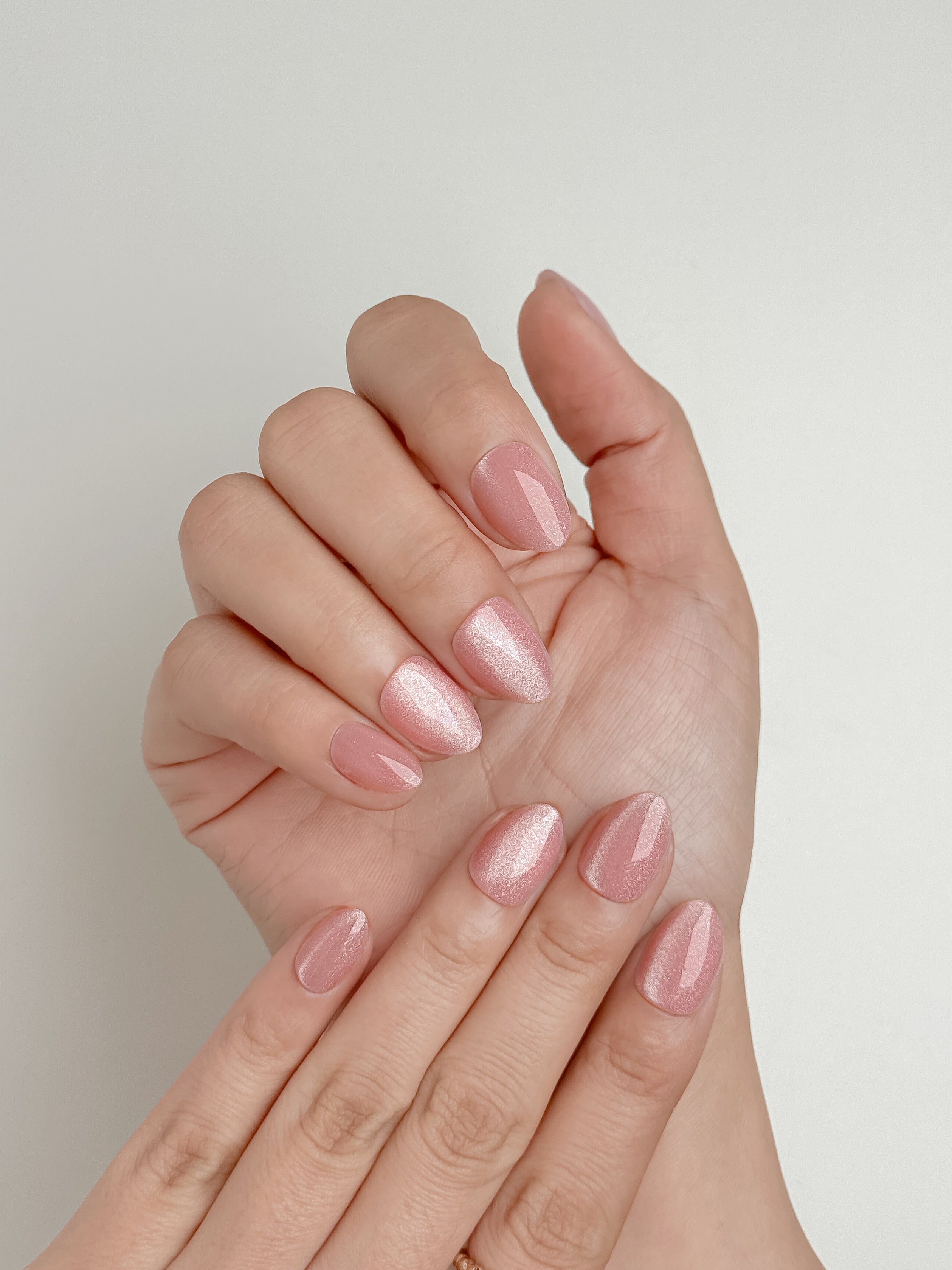 A luminous soft pink with micro-shimmer that adds glow and elegance without overpowering.