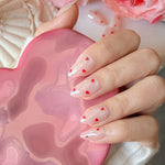 Playful and romantic, Sweetheart captures that fluttery feeling of love with every glance. Featuring vivid red mini hearts over a sheer nude base, this design is both cute and chic — a subtle way to wear your heart on your nails. The short almond shape keeps the look soft and modern, perfect for everyday wear or special date nights.